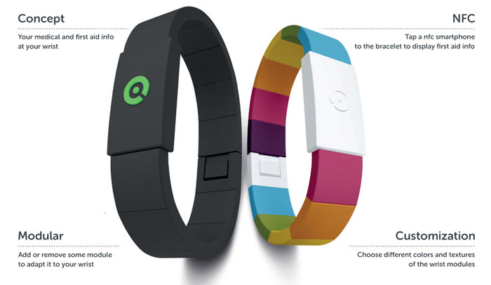 Introduced to the world via an Indiegogo crowdfunding campaign, the customizable modular bracelet uses NFC (Near Field Communication) to communicate with a smartphone or tablet, and to “take the medical alert bracelet to the next level.”