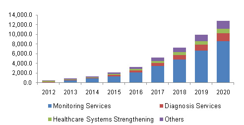 At an estimated CAGR of 49.1% from 2014 to 2020, the Asia Pacific market is expected to grow the fastest.Further, monitoring services include chronic disease management, independent aging solutions, and post acute care services; diagnosis services enable healthcare professionals to connect with patients for offering diagnosis of ailments as well as health related issues. Regulatory support is expected to drive the use of aforementioned services demand which further includes interoperability and standardization.