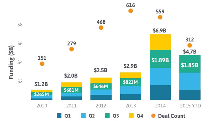 Seed and Series A rounds are still leading the way with 64% of funding activity in 2015, with Series B and C rounds continuing to increase their share, again demonstrating the maturation of the market.